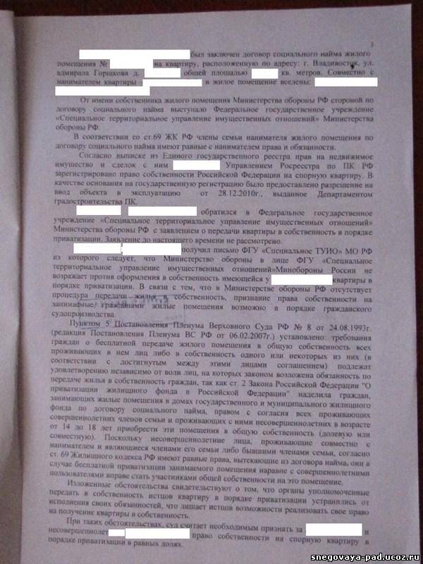| Quote (Алекс) Ведь с каждым днем лавинообразность ситуации обостряется и в связи с этим может что нибудь произойти Ну, Родину не выбирают Quote (Алекс) или значительное упрощение ситуации "Блажен, кто верует". Какого упрощения Вы ожидаете? ПМО, тот что в Минюсте на утверждении, в СП ничего не решит. Представитель собственника - СТУИО г. москва, право ОУ не зарегистрировано, сл-но СТУИО будет тупо мычать на Ваши обращения, сделать они ничего не смогут, пока право ОУ не зарегано. Более того, в декабре 2010 года был издан ПМО 1781, где ДвТУИО предписано "принять на грудь" все обязательства Влад. КЭЧ и не только ее, зарегистрировать право ОУ на объекты недвижимого имущества и много еще чего. Сегодня 21.11.2011 и мы все видим как выполнен ПМО 1781. Quote (Алекс) Теоретически возможна ситуация, что полученное с помощью судебного решения, свидетельство (а там в графе "основание возникновения права" будет указано решение суда) будет признано недействительным, т.к. суд подменил собой государство. Глупости зачем в прямом эфире говорить? Если бы государство передало мне квартиру в собственность, по изданному в 1991 году ФЗ, я не обращался бы в суд. Кроме того: СОБСТВЕННИК - наше с вами гос-во - РФ, а выполнить ФЗ не может. О какой подмене речь? Кто истцом будет? РФ????? В чьем лице СТУИО - не имеет права ОУ.